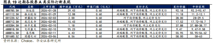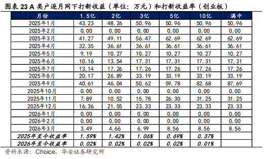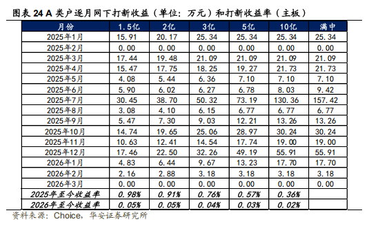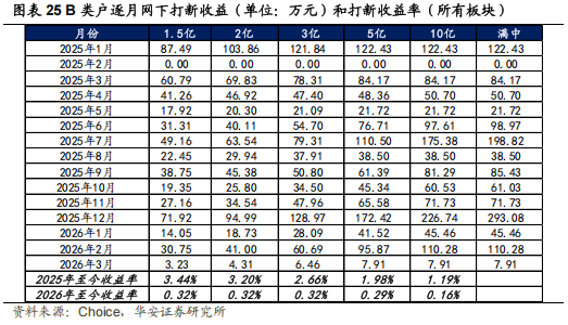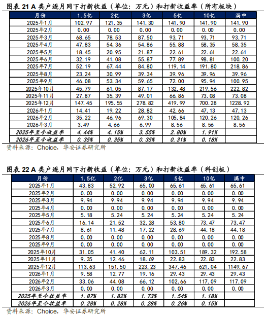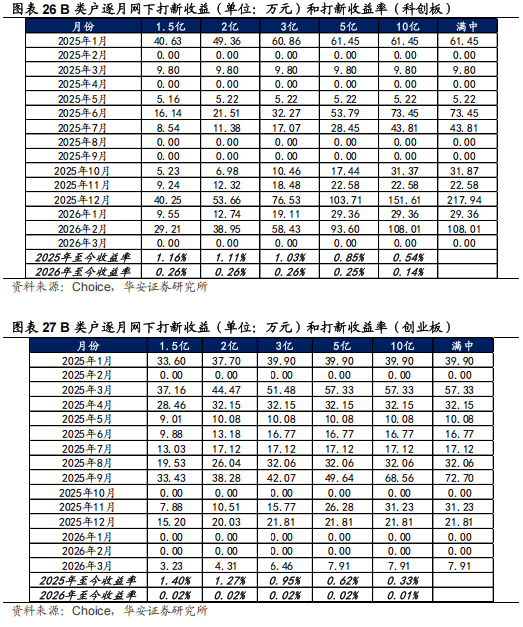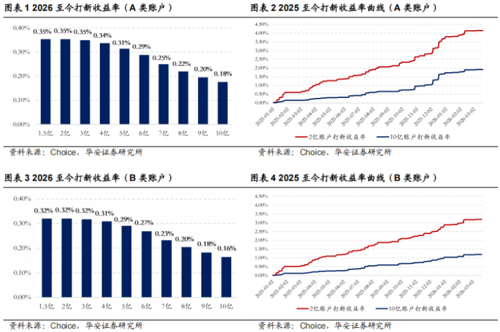 咱们追踪近期科创板+创业板+主板的网下打新市集推崇,假定通盘主板、科创板、创业板的股票王人打中,且上市首日以市集均价卖出,忽略锁依期的卖出规章,2026年适度3/20,A类2亿限制账户打新收益率0.35%,B类2亿限制账户打新收益率0.32%;A类10亿限制账户打新收益率0.18%,B类10亿限制账户打新收益率0.16%,如图表1、图表3所示,2025年以来的累计打新收益率弧线如图表2、图表4所示,A类分多档询价的股票以A类平均中签率臆度打新收益率。