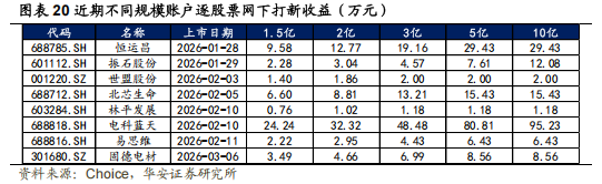 咱们测算了不同限制资金的网下A类打新收益。假定使用网下A类平均中签率、账户参与通盘新股打新、科创板和创业板报价沿途入围、资金竖立一半沪市一半深市且股票满仓、按初次开板日均价卖出、在90%的资金使用恶果下咱们测试不同账户限制下的逐股票网下打新收益。图表20列举了在1.5亿、2亿、3亿、5亿、10亿账户限制下,以A类平均网下中签率为例,假定科创板和创业板沿途入围,近两个月内(2026年1月19日至2026年3月20日)上市新股的网下打新收益。