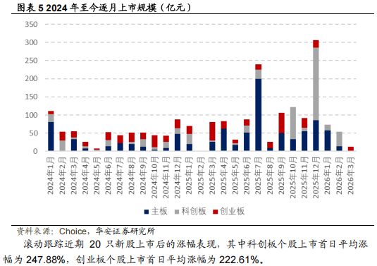 2024年以来逐月上市的新股限制如图表5所示。2026年3月沪深两市上市1只新股,募资限制12.01亿元。