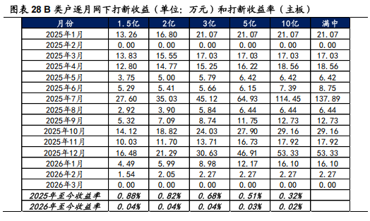 参照5.1中的测算神态,在不同限制B类户下,假定通盘股票报价均入围,在90%的资金使用恶果下,将2025年以来每个月网下打新可得回的收益相加,测算理思情况下逐月打新收益和打新收益率。以新股卖出日为统计时辰,2026年于今B类2亿打新收益率0.32%,2025年于今B类2亿打新收益率3.20%。