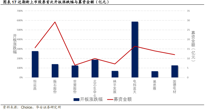 近两个月以来(2026年1月19日-2026年3月20日),大部分新上市股票的上市首日涨跌幅位于50%-600%水平区间内,上市首日涨跌幅最高的三家为电科蓝天、恒运昌、北芯生命-U,分辩达到585.75%、276.44%、185.65%。大部分新股募资金额位于5-20亿元水平区间内,其中募资金额最高的三家为振石股份、电科蓝天、恒运昌,分辩为29.19、16.45、15.61亿元。
