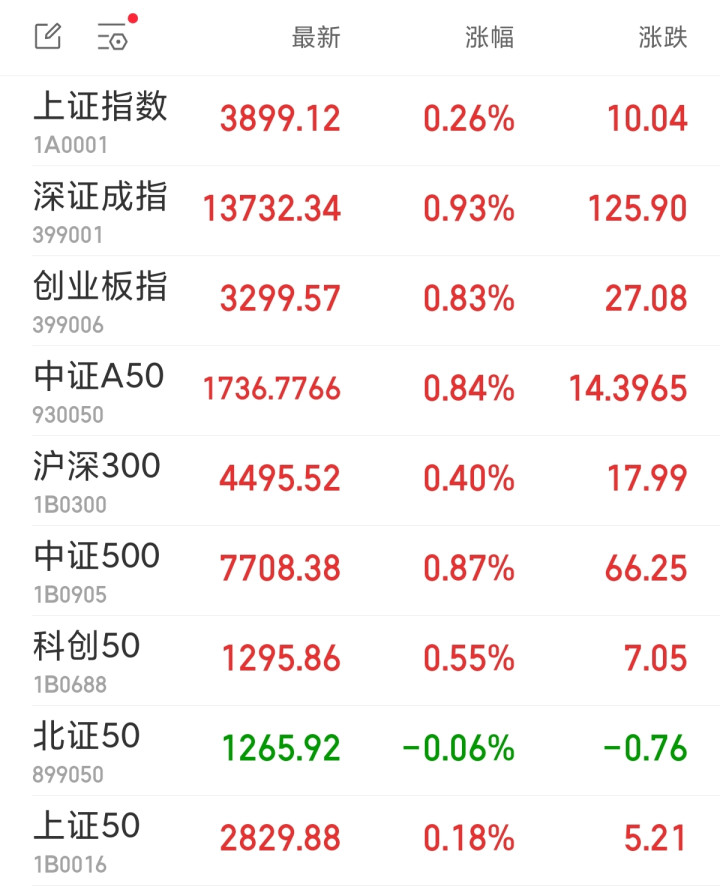 中新经纬3月27日电周五早盘,A股三大指数低开高走。鸿沟午间收盘,上证指数涨0.26%,报3899.12点;深证成指涨0.93%,报13732.34点;创业板指涨0.83%,报3299.57点。