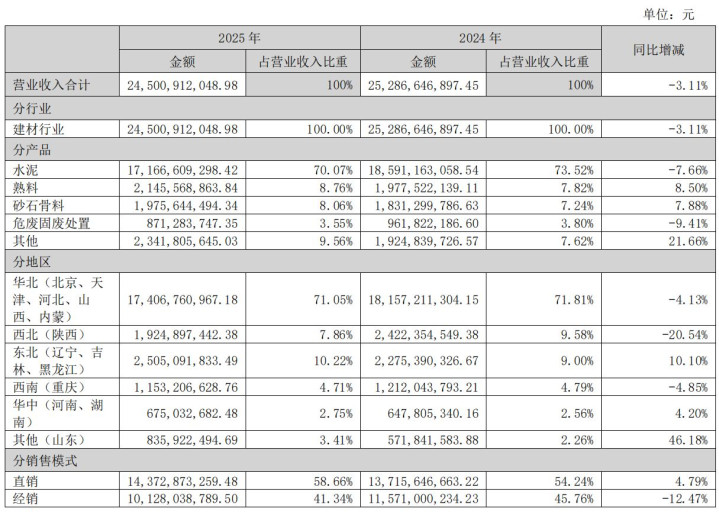 分家具来看,2025年金隅冀东的水泥和危废固废惩处业务营收较上年同比出现下滑,熟料、砂石骨料同比飞腾。