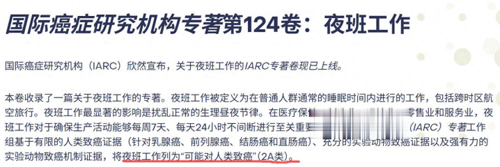 全国卫生组织把夜班责任列为2A类致癌身分,风趣是很可能对东谈主类致癌。