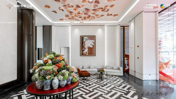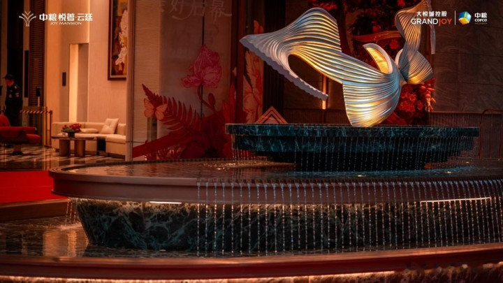 穹顶之下,艺术安装以凤凰振翅之姿舒展一羽翼的曲线凝练着翱翔千仞的动势,金属与光影交汇出“羽衣翩跹"的灵动韵律,寓意凤凰来仪,为家眷镌刻尊贵与温柔的底色。“云庭”则呼应树态度景,暗含乞丐变王子,官运亨通,让每一次收支王人怀卓越之心。