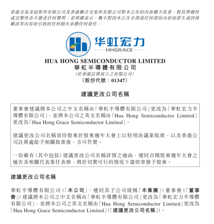 华虹半导体有限公司(华虹公司:688347.SH;华虹半导体:01347.HK)拟变更公司称号为“华虹宏力半导体有限公司”,变更证券简称为“华虹宏力”,证券代码保抓不变。以上变更待关系单元批准后实行。