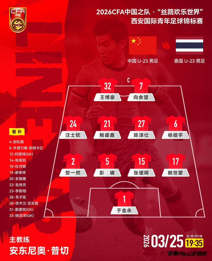 3月25日晚,2026西安海外后生足球锦标赛首个比赛日,中国U23队镇守西安海外足球中心,迎战泰国U23队。赛前,两边首发名单出炉。