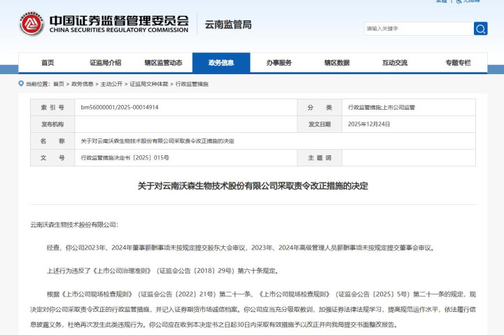 公告泄露,沃森生物2023年、2024年董事薪酬事项未按限定提交鼓舞大会审议,2023年、2024年高等惩处东说念主员薪酬事项未按限定提交董事会审议,因此对公司经受责令改正的行政监管设施,并记入证券期货商场诚信档案。