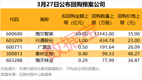 3月27日共有5家公司发布公告,拟进行股份回购,总共回购金额上限为62.19亿元。