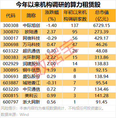 据证券时报·数据宝统计,A股中算力租借板块个股共有46只,从机构见谅度来看,岁首以来共有13股得回机构调研,中际旭创、欧陆通、网宿科技机构调研流派居前,分裂为137家、95家、56家。