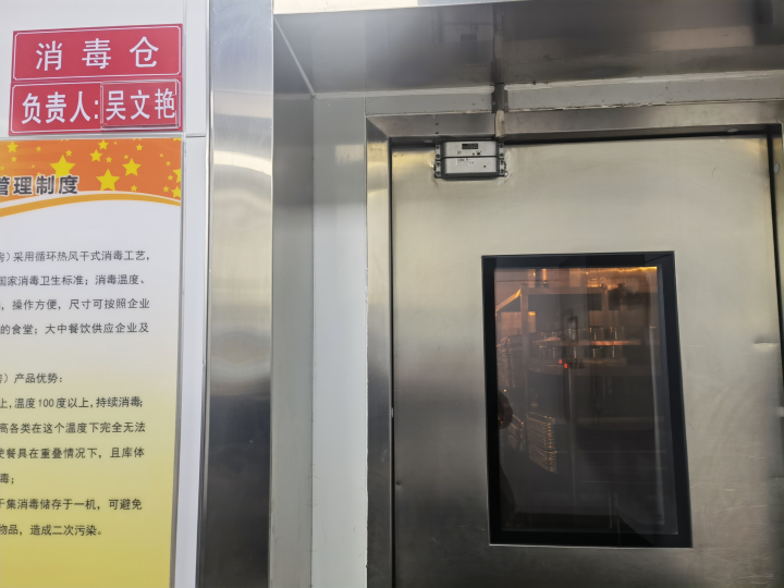 在衡水二中的厨房里,有一个相等的房间,“热力消毒房”,从门外就能看到,房间里亮着暖色的黄光,肥大的不锈钢架子上,放着成排的不锈钢锅碗笼屉,和传统的消毒柜比较,“热力消毒房”的成果更好,服从也更高。