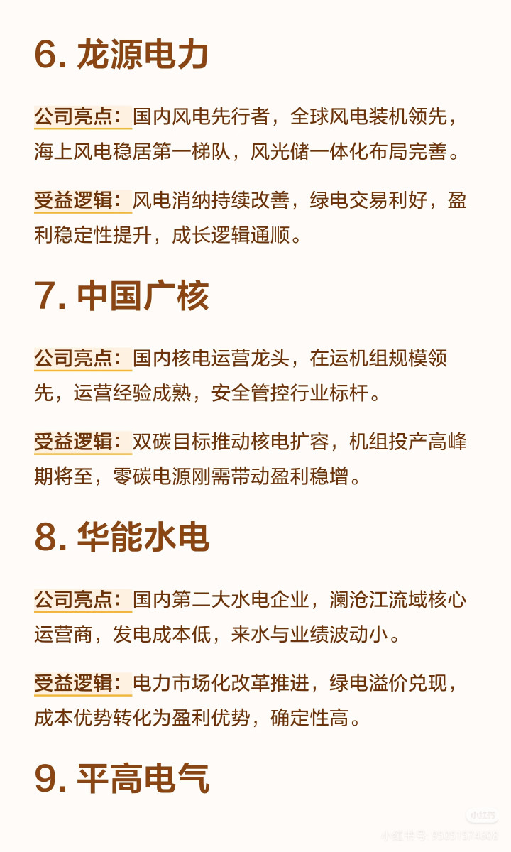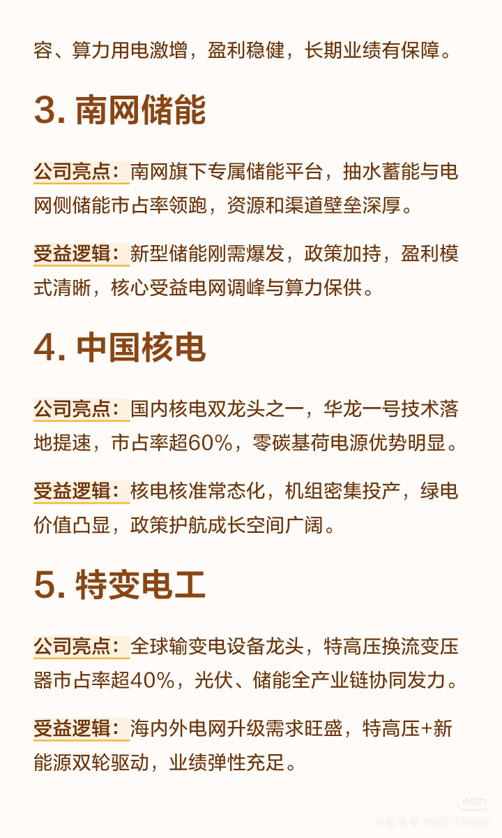 1. 长线矜重派:优先选长江电力、中国核电、国电南瑞,高壁垒+高分成+功绩笃定,是电力板块的“压舱石”,拿在手里不慌,还能每年吃分成。
