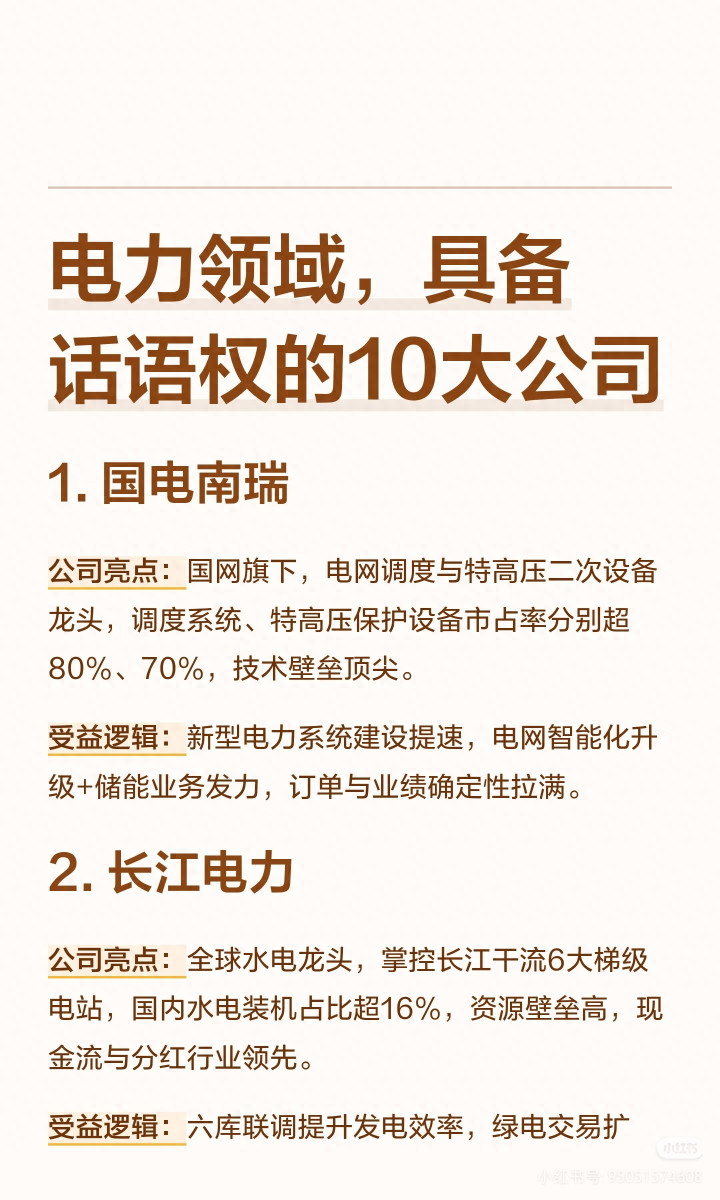 为什么电力能成为当下投资的香饽饽?说白了,双碳贪图鼓吹、新式电力系统成立提速,还有算力用电激增、电网升级刚需,齐让电力行业成了“不行能倒下”的优质赛说念。而这张图里梳理的电力领域10大具备语言权的公司,更是行业里的“龙头天花板”,集结我多年的投资实战素质,给全球把这10家公司的中枢逻辑、投资价值掰扯明晰,生手也能看懂照作念!