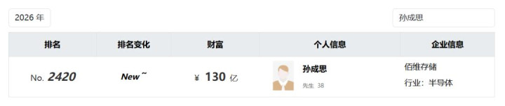 在3月初揭晓的《2026胡润大家富豪榜》中,孙成想以130亿元的钞票位列榜单第2420位。