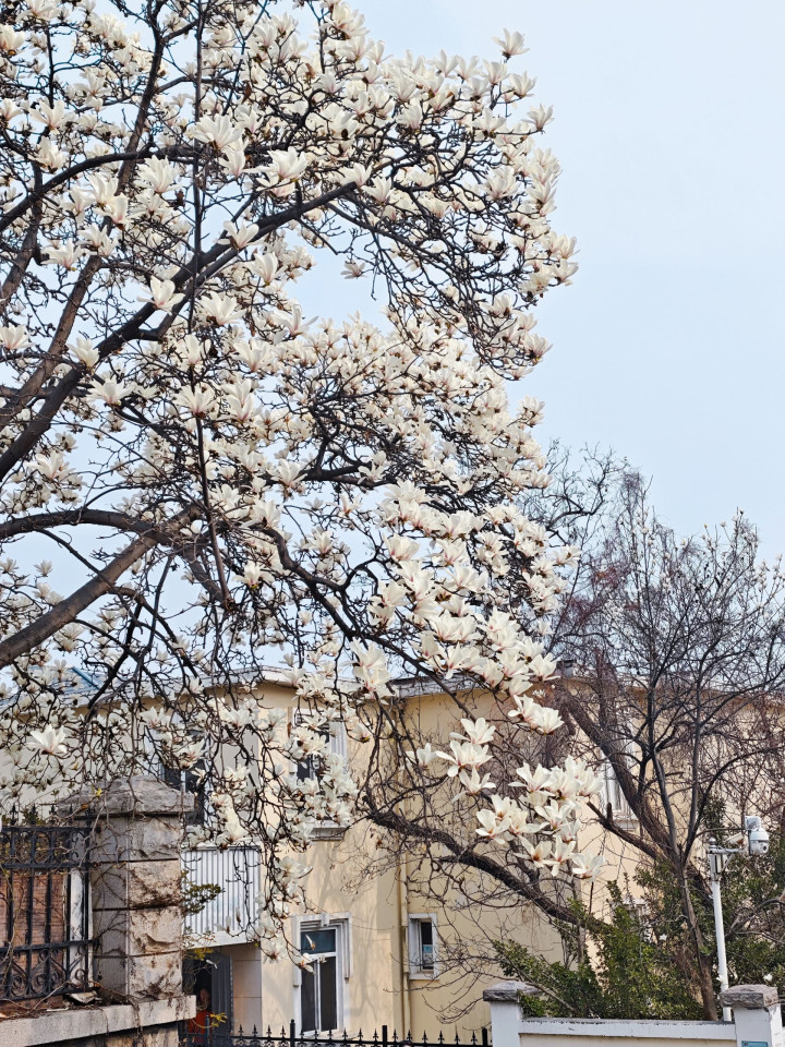 中枢赏花点金口一齐百年白玉兰,位于市南区金口一齐45号(金口一齐与鱼山岔路交叉口)。这里的网红白玉兰适值盛花期,白色花朵如雪般点缀枝端,花枝低落九牛二虎之力,海风轻拂时花瓣纷飞。站在石板路上仰拍,可将玉兰花与海平面、远方小鱼山的红瓦绿树同框,酿成“花—海—城”一体的自然油画质感。
