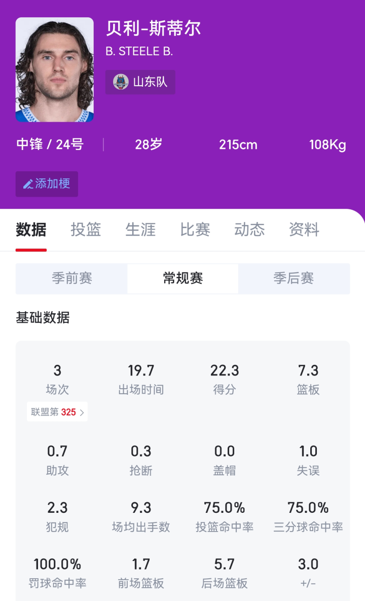 山东高速最近从国内NBL联赛签下的贝利·斯蒂尔,连合三场比赛得分上双,在场均接近20分钟的出场手艺内部,场均不错获得22.3分、7.3篮板、0.7助攻、0.3抢断。